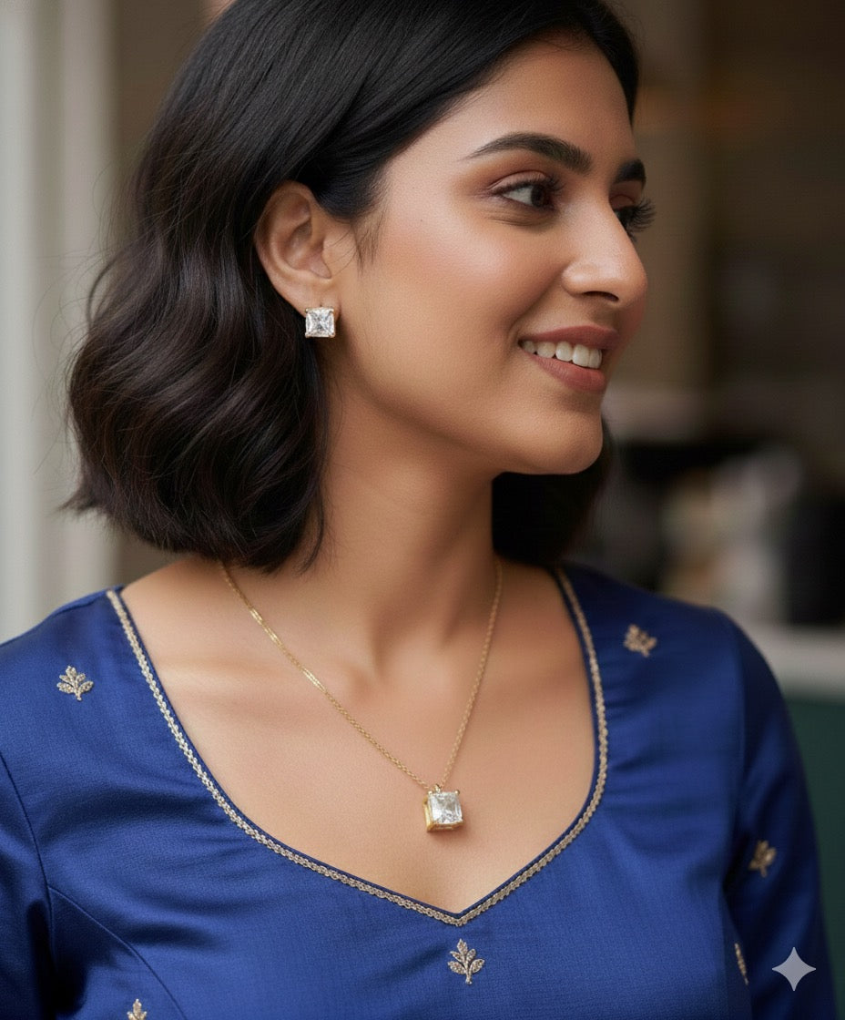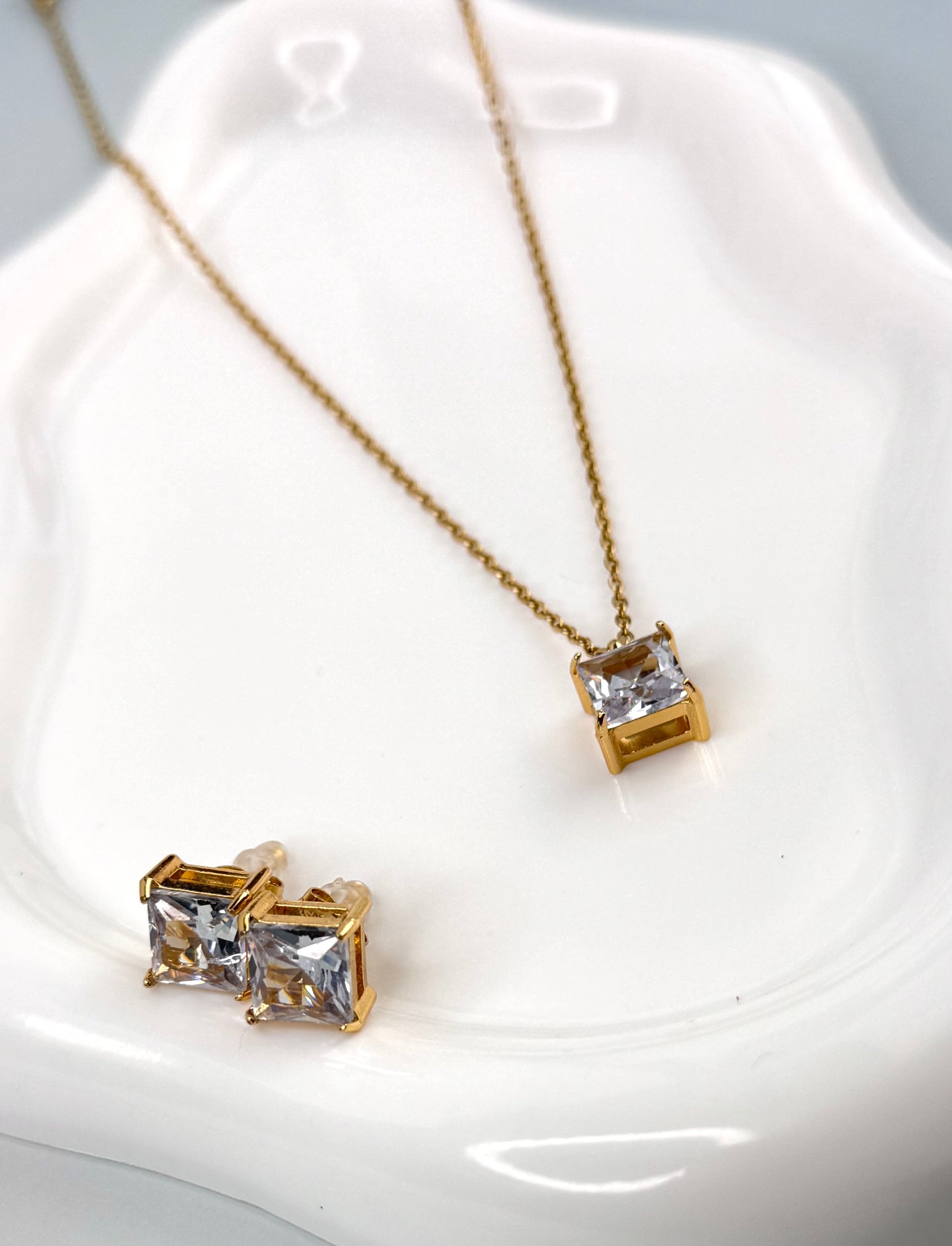 Expertly crafted with anti-tarnish stainless steel, this Prism chain set includes a stylish pendant and matching earrings. Enjoy long-lasting shine and durability while adding a touch of elegance to any outfit. Elevate your accessory game with this timeless and versatile set.